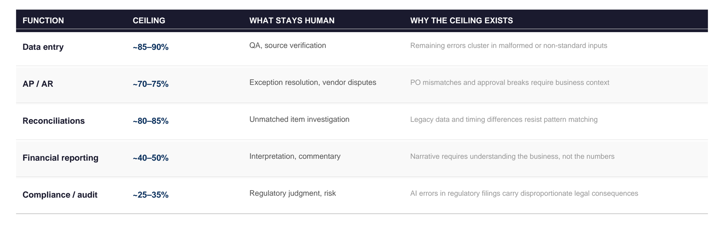 A model that correctly processes 95% of invoices is impressive. The 5% it gets wrong are disproportionately the high-value, complex transactions where a mistake is expensive. Push automation past the ceiling and you get hallucinated entries, missed exceptions, and audit findings that cost more than the headcount you cut.
